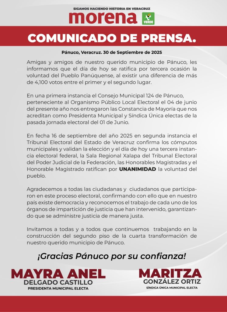 En Sesión pública celebrada por la Sala Regional de Xalapa del Tribunal Electoral del Poder Judicial de la Federación y por unanimidad de los magistrados se confirma el cómputo y la validez de la elección en Pánuco a favor de la fórmula encabezada por Mayra Anel Delgado Castillo y Maritza González Ortiz de los partidos Morena y Verde.