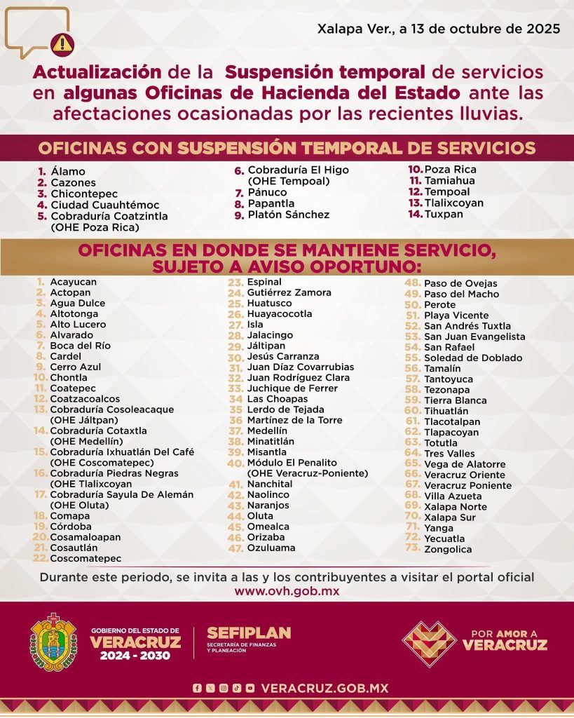 El gobierno del estado emitió el siguiente aviso en el cual las Oficinas de Hacienda del Estado suspenderán temporalmente sus servicios, los cuales se reanudarán en tanto las condiciones lo permitan y será informado a través de los canales oficiales.