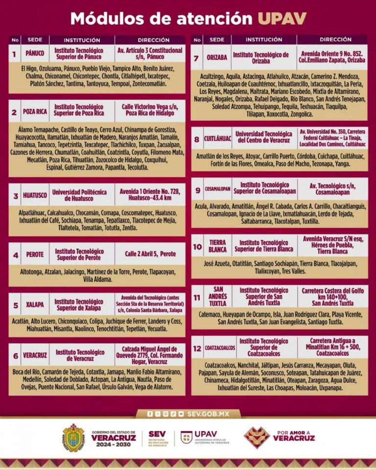 el directivo, la maestro o el maestro deberá acudir a uno de los 12 módulos UPAV más cercano a su domicilio, abiertos en horario de 08:00 a 17:00 horas: